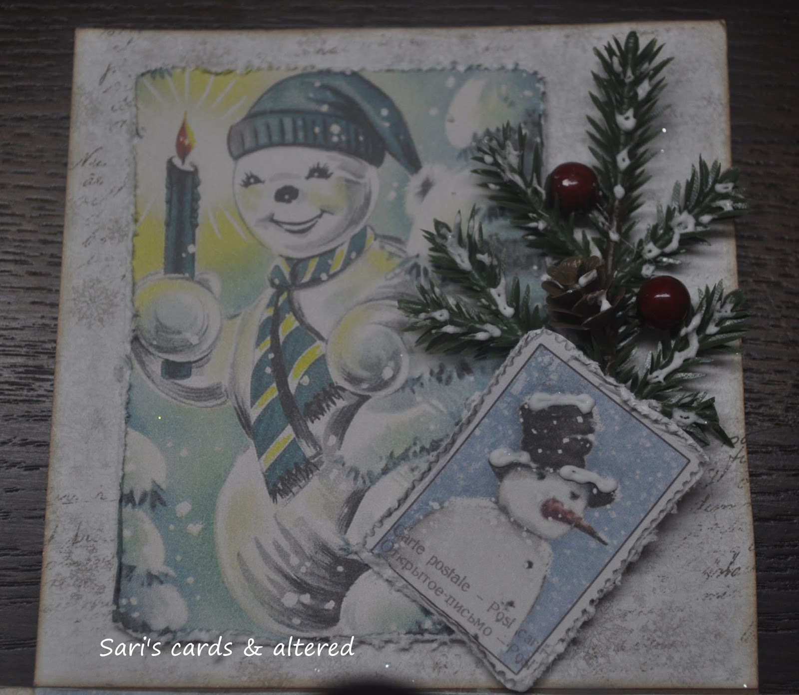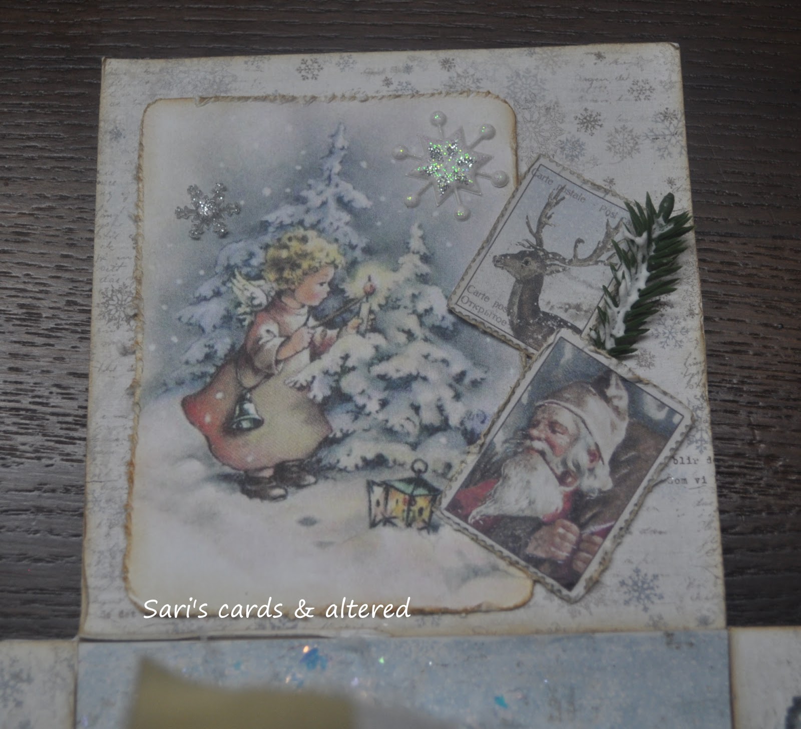 Toivottavasti kaikki voitte hyvin! Tänään mulla on explosion box teille. Useimmiten kun teen näitä, niin teen ne mini albumeiksi, lisäämällä sisälle "sivuja". Tästä tein joulu tervehdys laatikon... kannen päälle laitoin pikkuisen vihertävää ja marjoja, joittenka päälle laitoin "lunta" siihen käytin (Snow paste) Sitten kun avaa laatikon (nostaa kannen) niin se "hajoaa" ja esille tulee kaikki sivut. leikkasin erillaisia joulukuvia ja pikkuisen koristeita sivuihin.