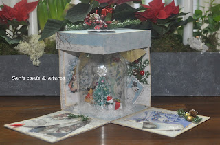 N'r man lyfter locket, så faller lådan isär, och på sidorna finns juliga bilder som jag klippt ut. I mitten finns en glas kupa som jag köpt från panduro. Den har jag limmat fast, så risken att den går sönder är liten. Inuti globen/kupan har jag gjort ett litet vinterlandskap med hjälp av miniatyr träd,pärlor, låtsas snö och lite annat smått och gott!
